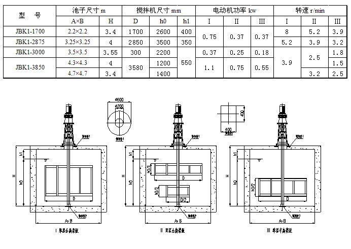 常見用途: 主要用于給水廠、污水處理廠投加藥劑的溶解攪拌。 型號表示: I、單層全高槳板 II、雙層全高槳板 III、單層半高槳板 技術(shù)參數(shù):